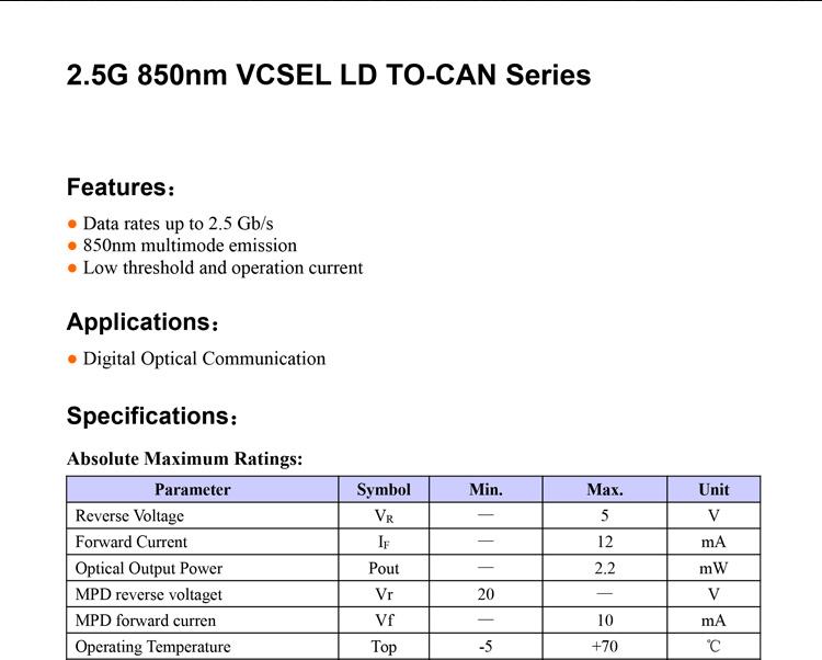 Subject : 2.5G 850nm VCSEL LD TO-CAN Series Laser diode
