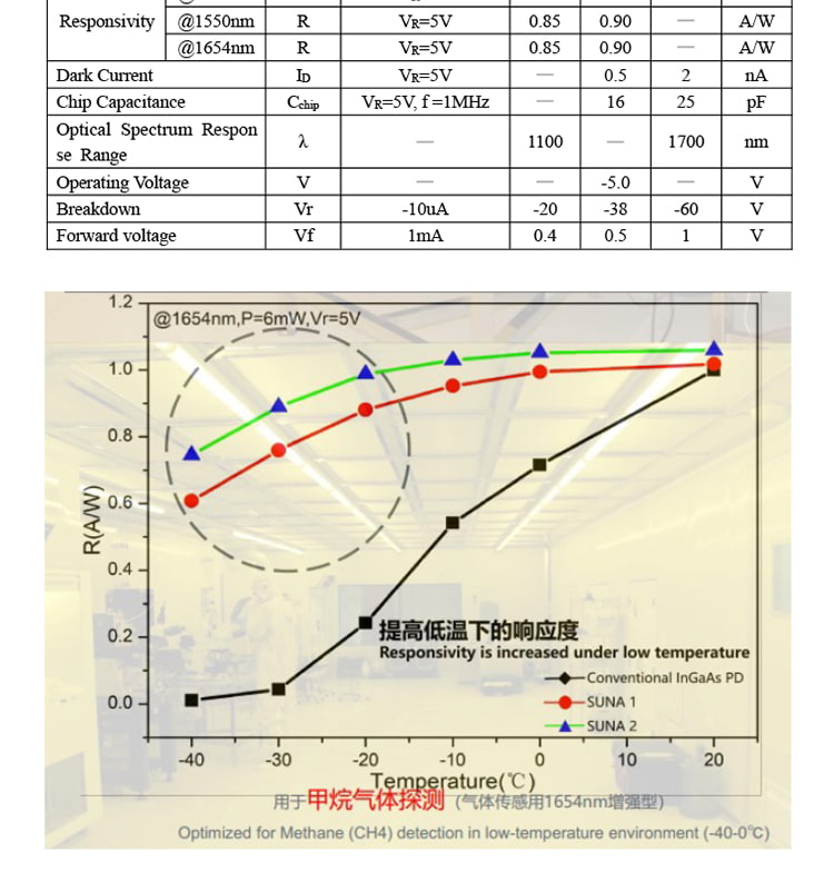 ● Optimized for Methane(CH4) detection(1654nm),improving responsivity in low-temperature environment